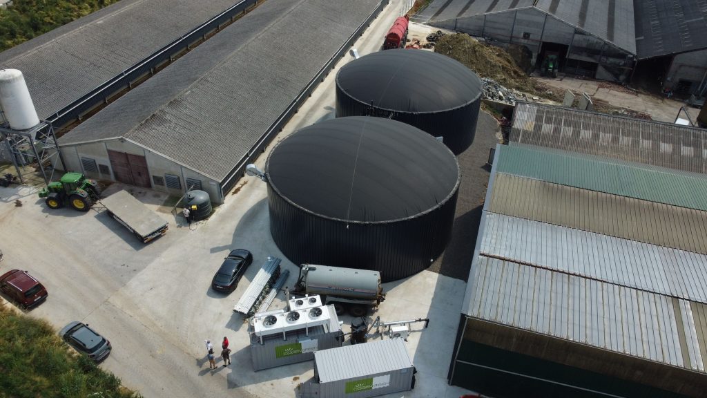 La photo vous donne une vue aérienne de la ferme où vous retrouvez notamment les deux containers de la cogénération, les deux digesteurs et à l’arrière-plan la cuve de stockage de digestat.