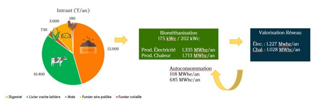 - produit de la chaleur renouvelable : 1.713 MWh/an dont plus d’un tiers 685 MWh sont auto-consommés (chauffage des bâtiments notamment les deux entrepôts poulaillers (en face des deux digesteurs).