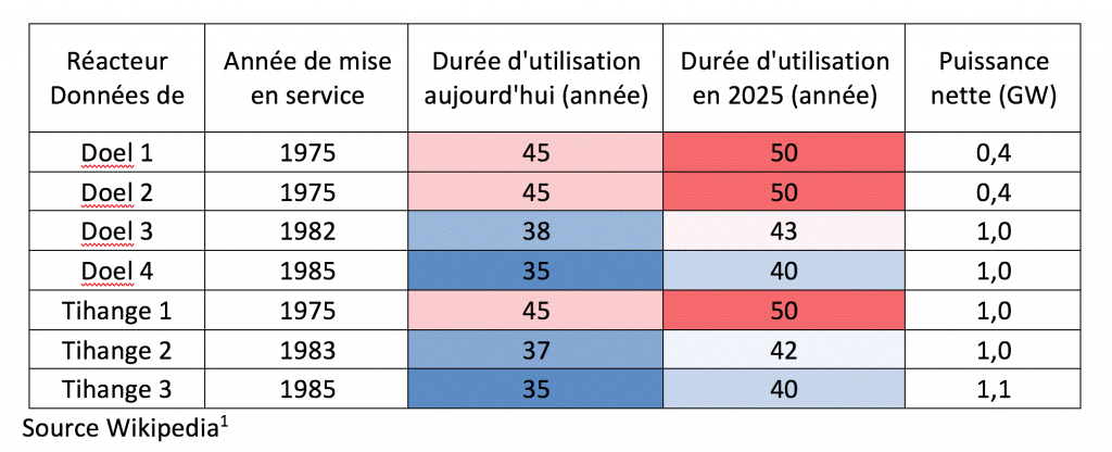 En prélude, nous souhaitons rappeler le risque nucléaire en Belgique, qui inquiète grandement le voisin allemand. Bien que le discours pro-nucléaire aime avancer qu’une centrale bien entretenue peut durer éternellement, cette affirmation est fausse. En effet, un élément des centrales ne peut être changé : la cuve en acier qui entoure le réacteur et doit rester hermétique. Dès la mise en fonctionnement, cet élément est soumis à un bombardement de particules à haute énergie. Les bulles créées dans l’acier induisent des micro-fissures qui fragilisent le cœur de nos réacteurs, pouvant conduire à l’accident nucléaire. Les ingénieurs qui ont conçu nos centrales connaissaient bien ce phénomène et leur ont dès le départ définit une durée de vie limitée, de 30 à 40 ans. Le tableau ci-dessous résume les durées d’activité des 7 réacteurs nucléaires encore en service en Belgique, aujourd’hui en 2020 et en 2025 lorsque l’arrêt des 7 réacteurs est envisagé. Le prolongement jusqu’en 2025 de Doel 1, Doel 2 et Tihange 1 est extrêmement dangereux.