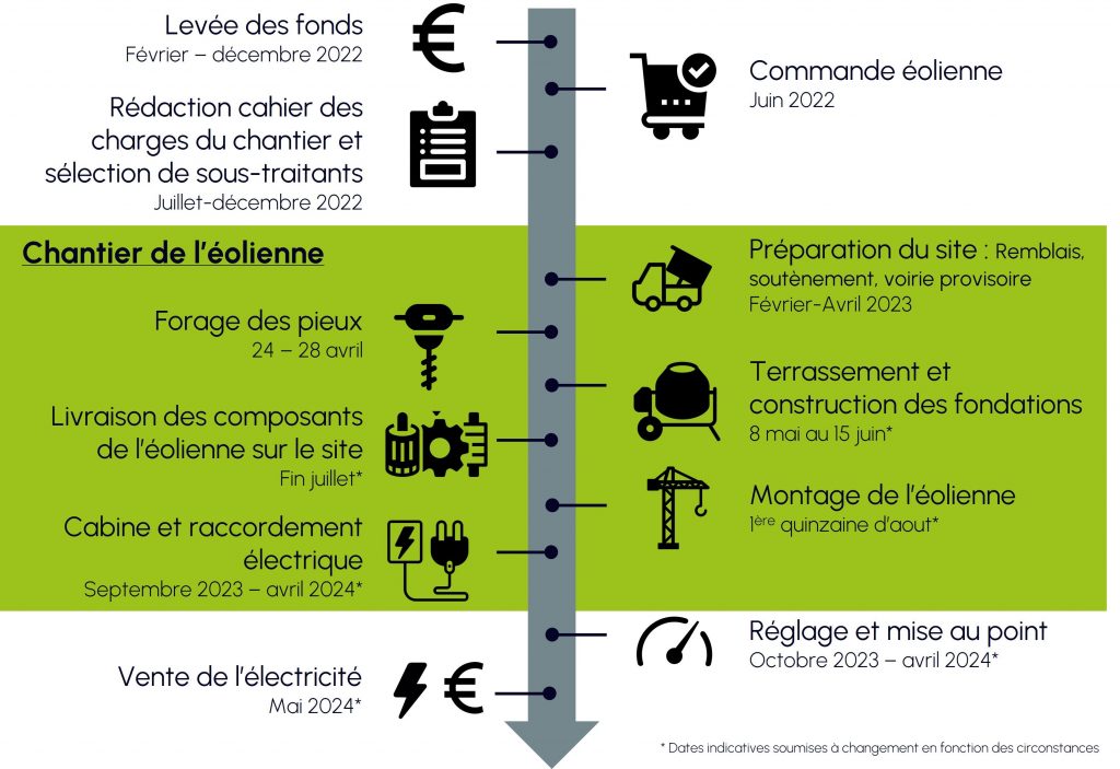 A ce stade, le chantier est terminé, et la phase de mise en service peut démarrer. L’éolienne doit être démarrée progressivement et être réglée. Le réglage terminé, la vérification des spécifications de l’éolienne a lieu. La puissance délivrée est vérifiée à différents régimes de vent et comparée à la puissance spécifiée. Ces dernières étapes auront lieu entre octobre 2023 et avril 2024 et la vente de l’électricité de l’éolienne devrait démarrer en mai 2024.