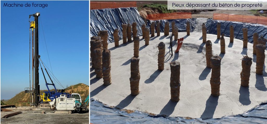 Entrons davantage dans les détails du chantier. Quand le terrain n’est pas suffisamment ferme, certains projets nécessitent des pieux. Pour notre éolienne, ils sont au nombre de 24 avec une profondeur de 19 m. Un forage est réalisé à l’aide d’une machine spéciale. Un ferraillage est ensuite glissé dans le trou et du béton est coulé pour former un béton armé.