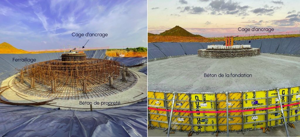 Après cela, la « fouille » est excavée : c’est un trou de 3 mètres de profondeur et de 17 mètres de diamètre qui , dans ce cas, va accueillir la fondation en béton armé. Cette dernière est composée au centre d’une « cage d’ancrage » en acier de quelques mètres de diamètre qui sera accrochée à la future éolienne  et d’un ensemble de ferraillage qui occupe les 17 mètres de diamètre de la fouille. Un béton est ensuite coulé.
