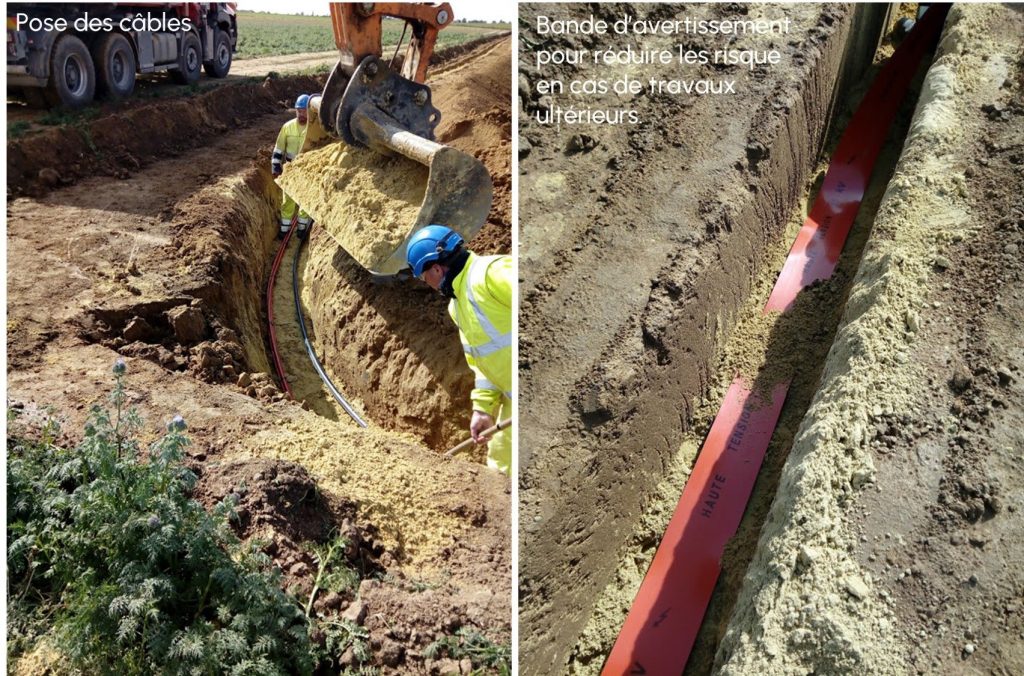 La dernière étape du chantier est tout un travail en soi : connecter l’éolienne au réseau. Des tranchées sont creusées pour la pose de câbles capables de supporter les courants générés par l’éolienne. Finalement, une cabine sera construite pour contenir le compteur et les composants électriques.