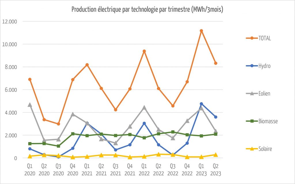 Tout confondu, la production totale d’électricité augmente de 2.000 MWh par rapport à la même période en 2022, grâce aux nouvelles centrales d’hydroélectricité et à la pluviométrie importante. La diminution de 3.000 MWh par rapport au 1er trimestre 2023 est habituelle. Elle due à la saisonnalité de l’éolien et de l’hydroélectricité, comme vous pouvez le voir sur les graphiques ci-dessous.