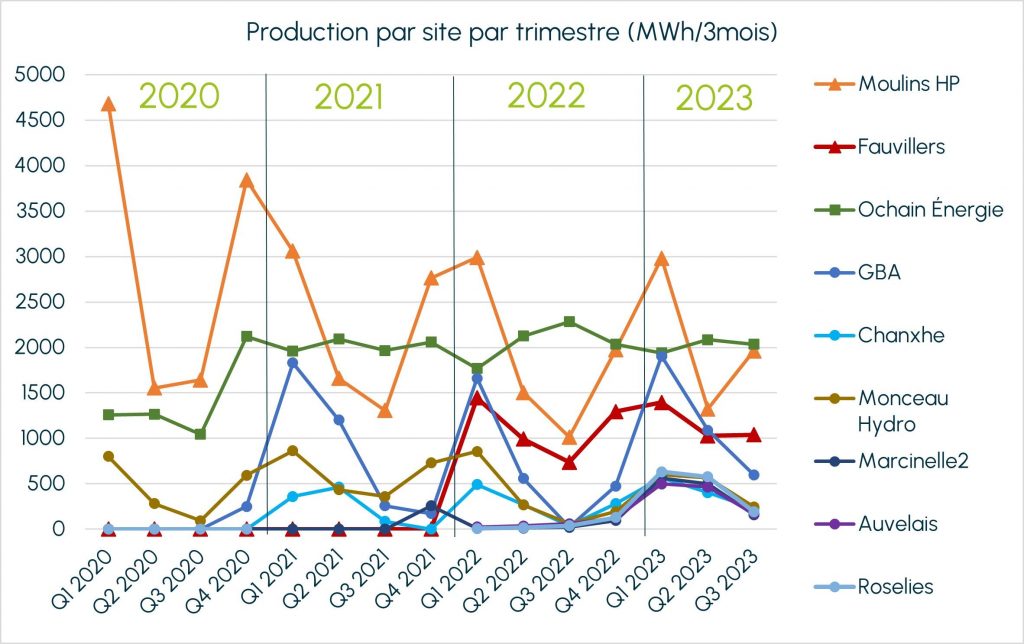 En hydroélectricité, logiquement, on s’attendait à un creux de la production en été. Ce ne fut pas le cas : une production surprenante, plus de 6 fois supérieure à celle de la même période en 2022 ! Sur l’Ourthe, les sites des Grosses Battes (Liège) et de Chanxhe (Sprimont) totalisent 827 MWh, contre 61 MWh en 2022. Sur la Sambre, les 4 sites ont produit 771 MWh, contre 100 MWh au troisième trimestre 2022.