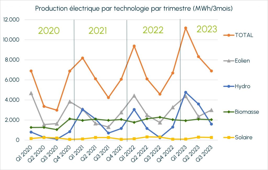 La variation d’une année à l’autre se confirme aussi avec la production photovoltaïque. Nos trois sites totalisent 265 MWh, contre 301 MWH pour la même période en 2022. La production du troisième trimestre 2023 aurait, certes, pu être un peu plus élevée, ce qui est dû à des soucis avec quelques onduleurs.