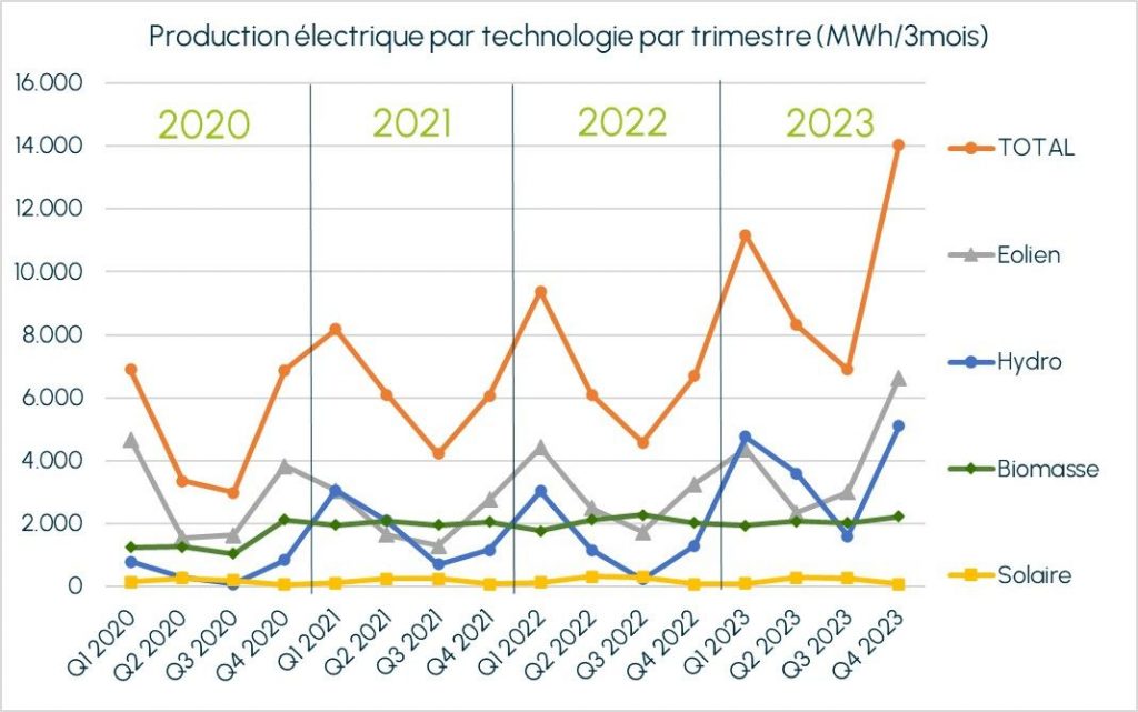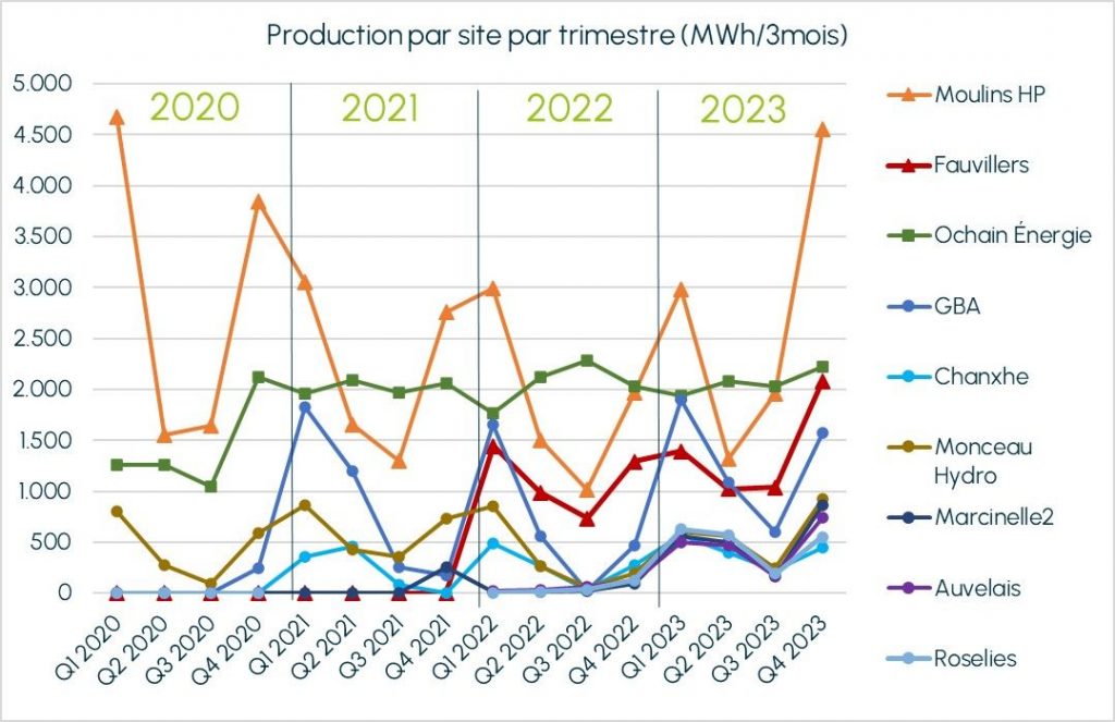 En ce quatrième trimestre 2023, la nature nous a fait plusieurs cadeaux. C’est pourquoi la production électrique de 14.043 MWh* fait plus que de doubler les 6.688 MWh de la même période 2022, et cela sans l’apport d’aucun nouveau site de production ! Regardons tout cela en détail.