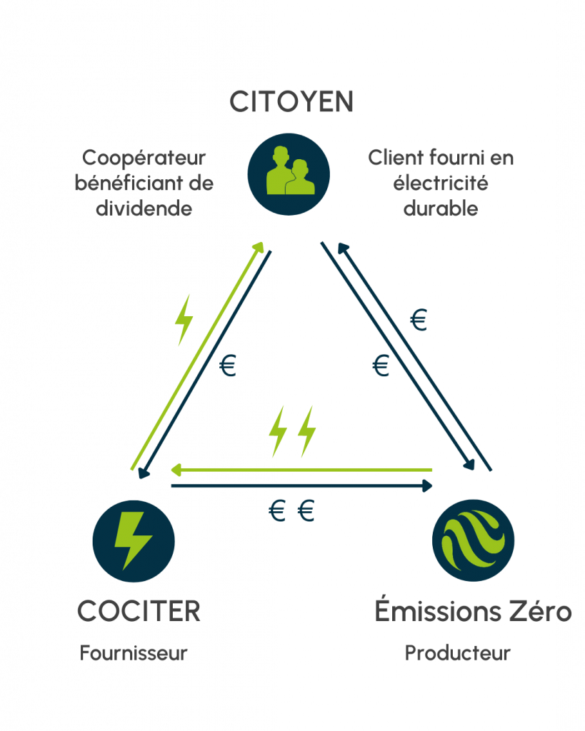COCITER est une coopérative de fourniture d’électricité verte, dont Émissions Zéro est co-propriétaire depuis 2017. Elle fournit exclusivement de l’électricité produite par des coopératives citoyennes, comme la nôtre.